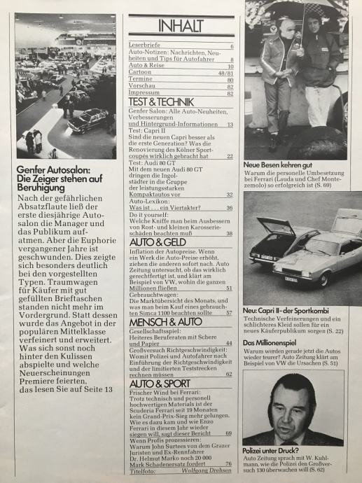 Auto zeitung`74.reportaža Ferrari F1 Lauda Regazzoni +test:A80+Capri