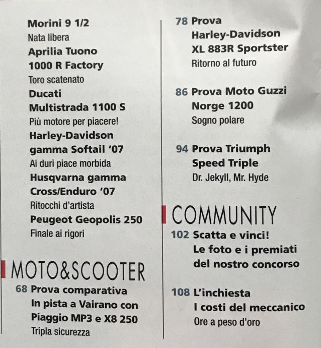 Dueruote 11/06 test: Piaggio + Harley-Davidson + Moto Guzzi + Triumph
