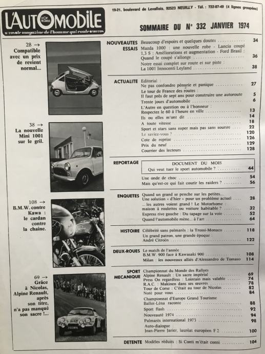 L`Automobile 1974. Test: Mini 1001 +BMW 900S vs Kawasaki 900/ Rally 73