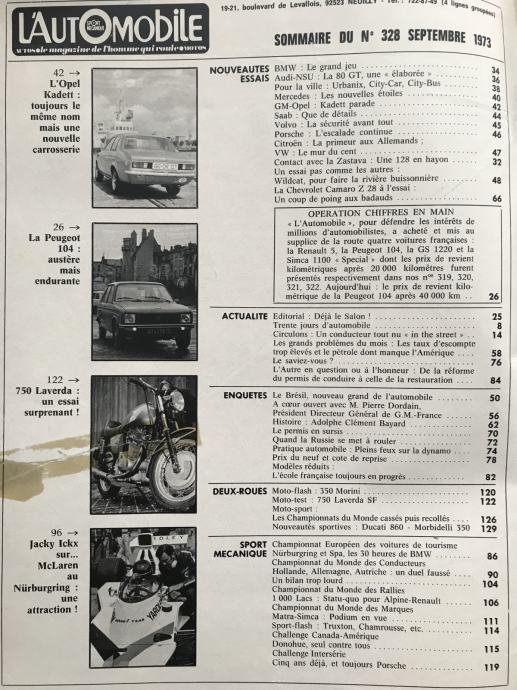 L’Automobile’73.test Camaro Z28 + Zastava 1100 Laverda 750 Peugeot 104