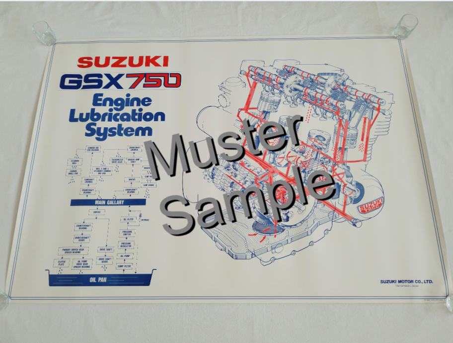 ORIGINALNI poster, plakat presjeka motora od SUZUKI GSX750 - SUSTAV PODMAZIVANJA MOTORA, iz 1979. godine, nije presavijen, odlično očuvan, zarolan u rolnu, prodajem. Riječi MUSTER i SAMPLE nisu vidljive na plakatu, samo su na slici u oglasu.