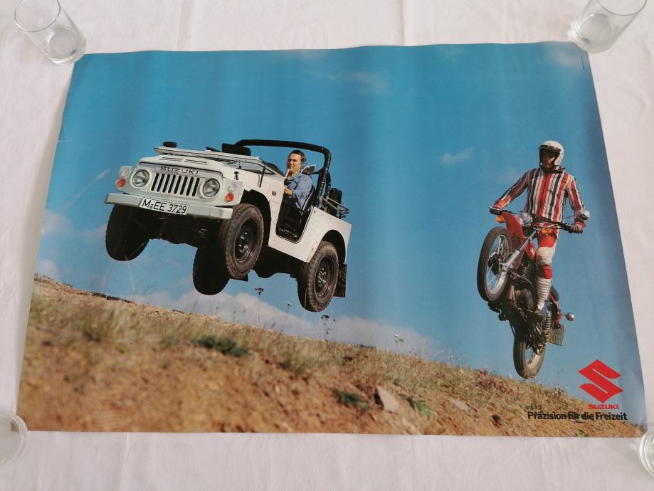 ORIGINALNI PLAKAT POSTER SUZUKI ĐIP + MOTOCIKL ENDURO, na lakiranom papiru, odlično očuvan, savijen u rolnu, prodajem.