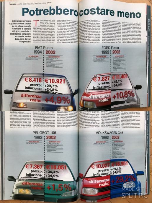 razlika u cijeni i opremi kompakata između 1992. i 2002.; Golf III/IV + Punto I/II + Ford Fiesta + Peugeot 106, na 6 str