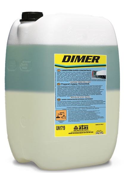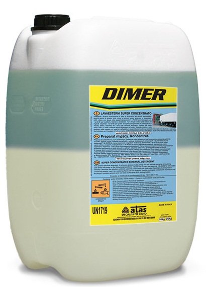 super koncentrat za čišćenje vanjskih površina za profesionalnu uporabu.Dvokomponentni alkalni deterdžent namijenjen za čišćenje automobila kamiona, kontejnera, autobusa i drugih vozila, bez uporabe četke, osim u posebno prljavim područjima. Skida prljavštinu od smoga, masti, prstiju itd.Ne oštećuje lak. Također se koristi za čišćenje vanjskih dijelova motora i šasije. Glavna karakteristika Dimera je njegova učinkovitost i biorazgradivost elemenata koje sadrži.Upotreba: Razrijediti s vodom u omjeru od 1 do 60-80 l ako se koristi za predpranje, 1 do 40-50 l ako se koristi za normalno čišćenje, 1 do 5-10 l za čišćenje motora i bicikla. Poprskajte otopinu od vrha prema dnu, a zatim isperite miniwashom (hladnom vodom).