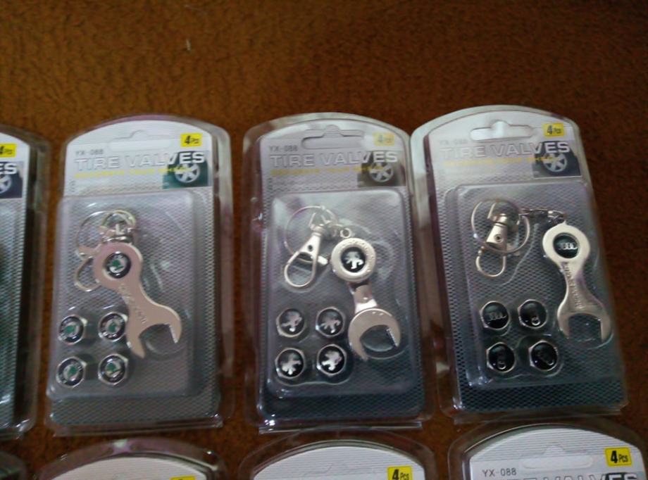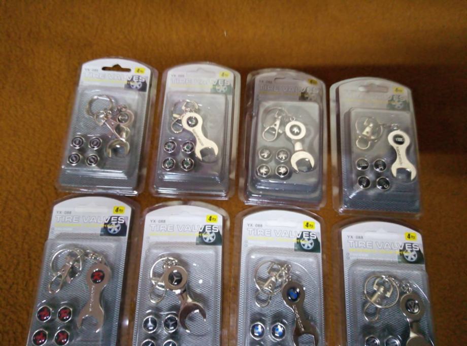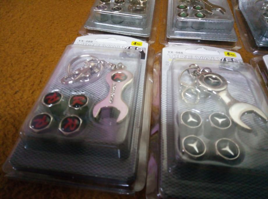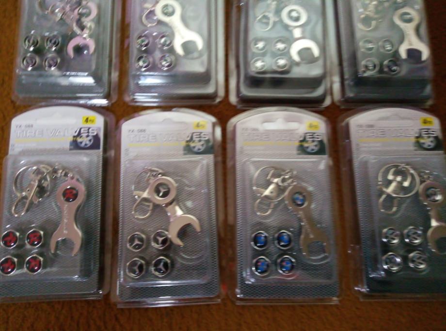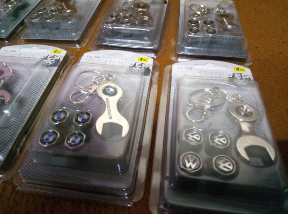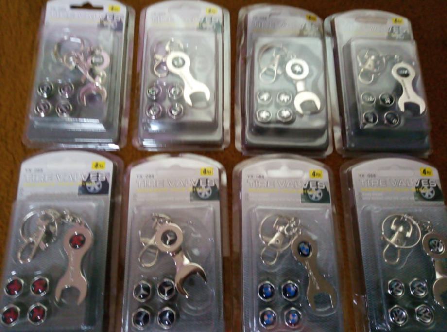 prodajem metalne kapice za ventile s logom vozila i privjeskom koji je ujedno i kljuc za stezanje protiv krade dostupno bmw,audi,mercedes,peugeot,volksvagen,opel,skoda,seat,renault,ford,citroen,fiat i r oznaka cijena jednog seta 4 kapice i privjesak 5€ fixno