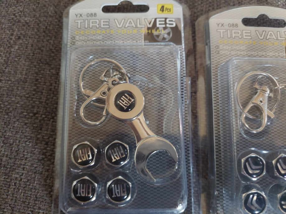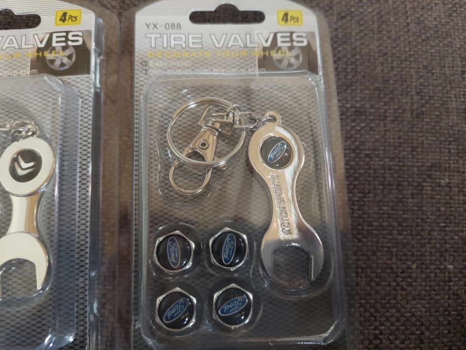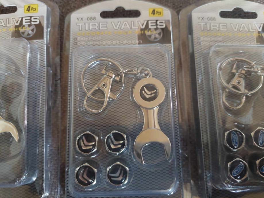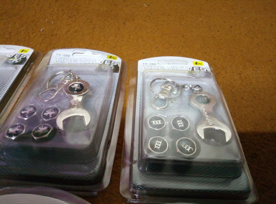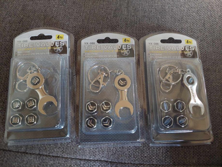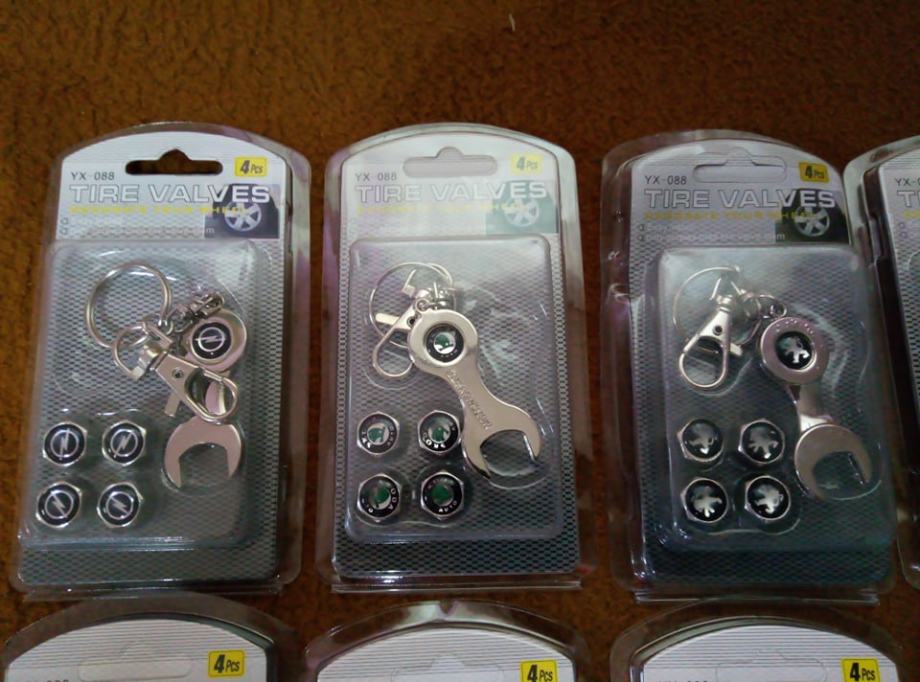 prodajem metalne kapice za ventile s logom vozila i privjeskom koji je ujedno i kljuc za stezanje protiv krade dostupno bmw,audi,mercedes,peugeot,volksvagen,opel,skoda,seat,renault,ford,citroen,fiat i r oznaka cijena jednog seta 4 kapice i privjesak 5€ fixno