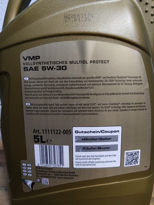 Prodajem Ravenol VMP 5W-30 ulje za auto. Potpuno novo u originalnoj i zatvorenoj ambalaži. Jedno od najboljih ulja za dizel motore sa DPF-om.