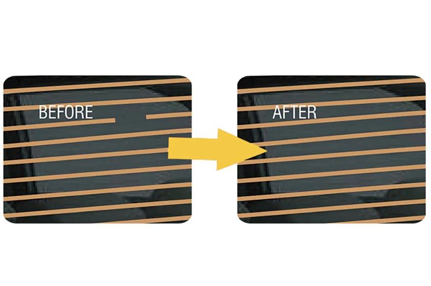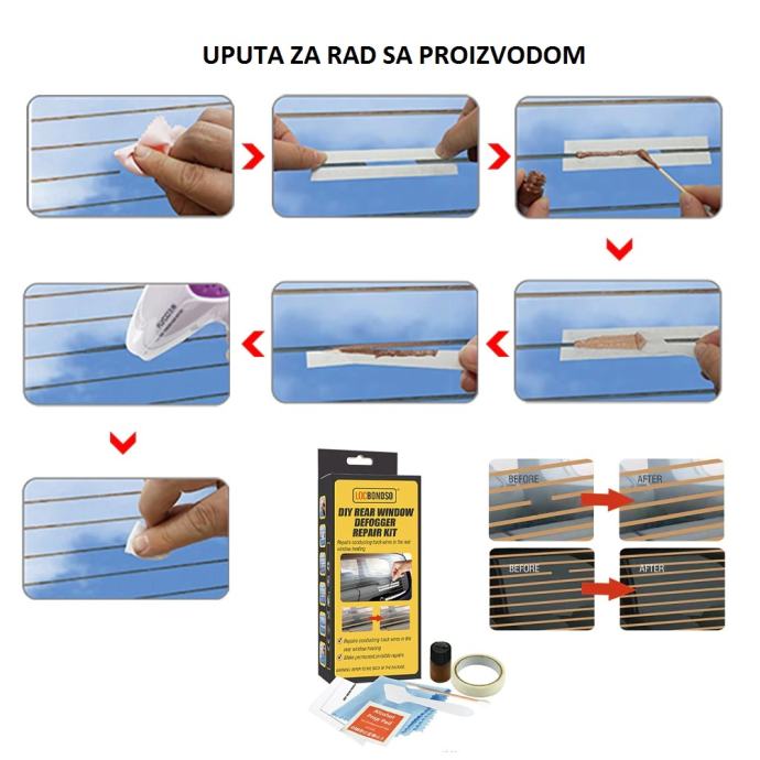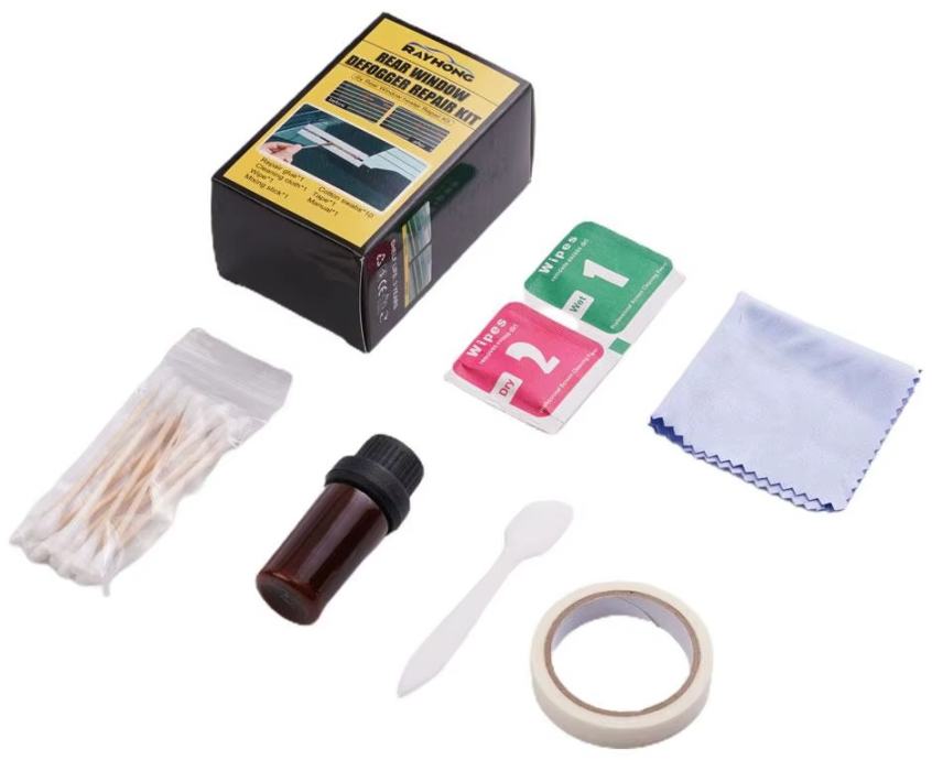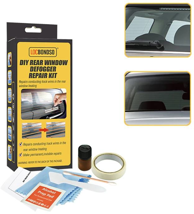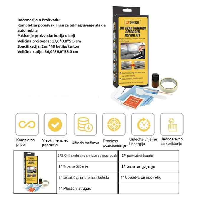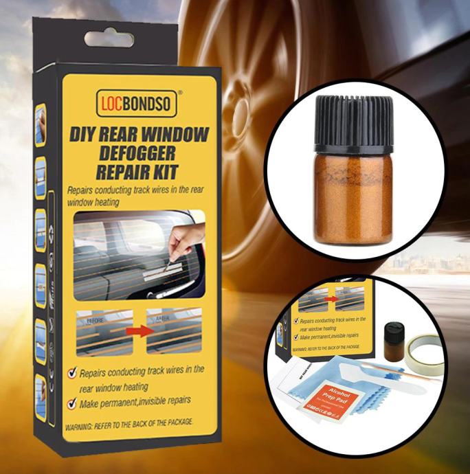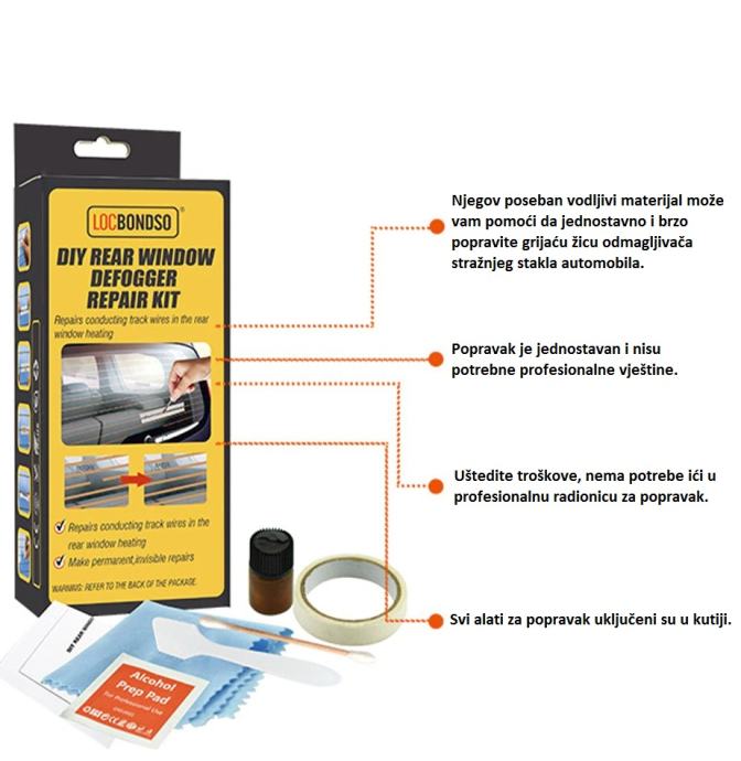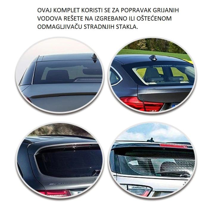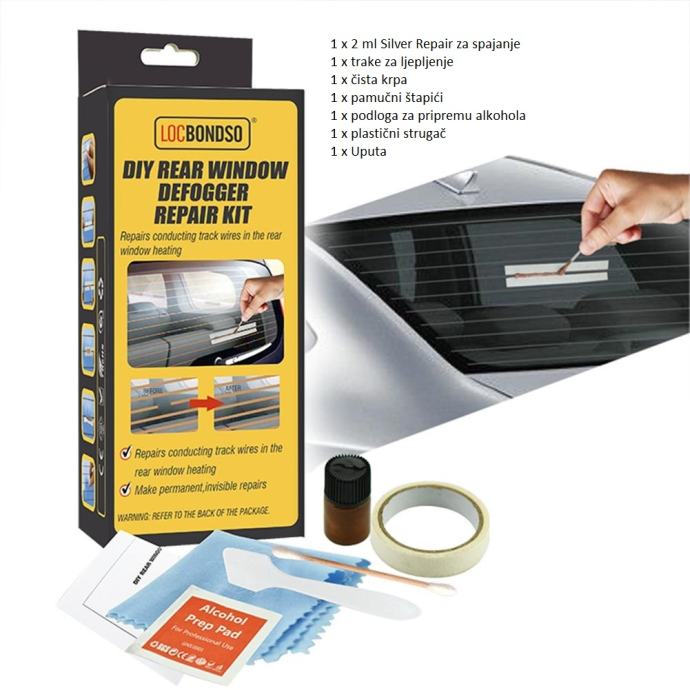 Komplet za popravak odmagljivača stražnjeg stakla dizajniran je za popravak izgrebenih ili slomljenih linija mreže odmagljivača stražnjeg stakla. Površine za lijepljenje moraju biti glatke i ravne. Popravci se idealno mogu izvesti na temperaturama od 10°C do 24°C. Omogućuje jeftin i kvalitetan popravak oštećenih rešetki i jezičaka dojavljivača stražnjeg stakla.