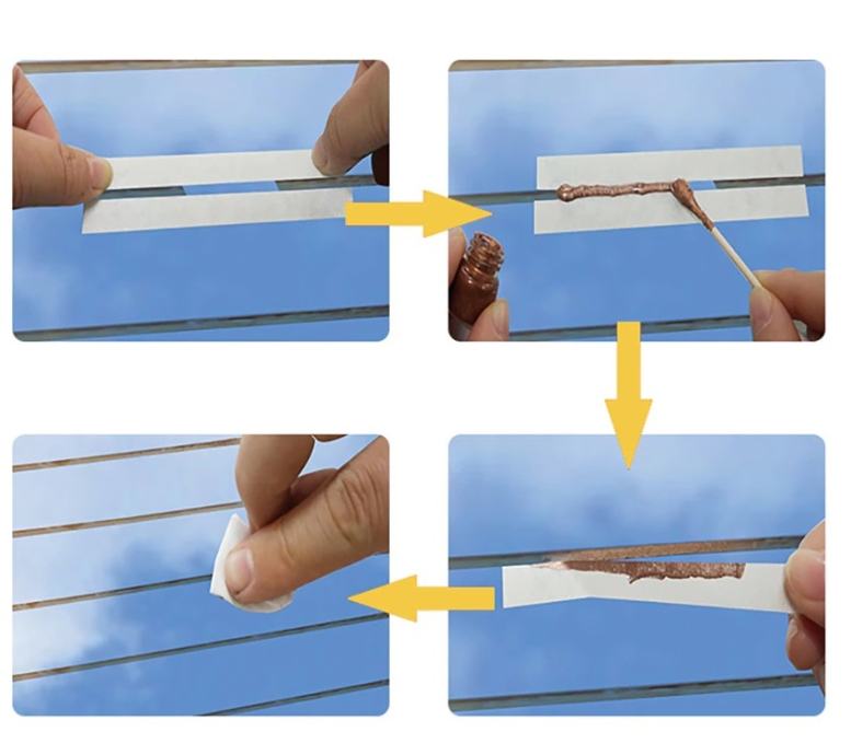 *Korak 4. Koristite plastičnu strugalicu da površine budu glatke i ravne. Pazite da se smjesa za popravak srebra preklapa s oba kraja isprekidane linije. Gledajte kroz prozor iznutra, kroz popravljeno područje ne bi trebalo biti svjetla. Ako svjetlo prođe, nanesite još jedan sloj mase za popravak.
