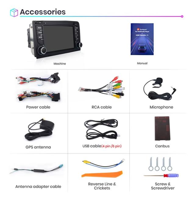Dodirni zaslon + radio + FM / AM + RDS + GPS navigacija + MAP + Wifi + Bluetooth + upravljanje na upravljaču + podijeljeni zaslon + USB + SD + AUX ulaz / izlaz + zrcalna veza + kamera za stražnji pogled + subwoofer + reprodukcija rane + EQ + Set tapeta + logotip automobila + 3G / 4G + TPMS + DAB + OBD 2 + DVR + TV