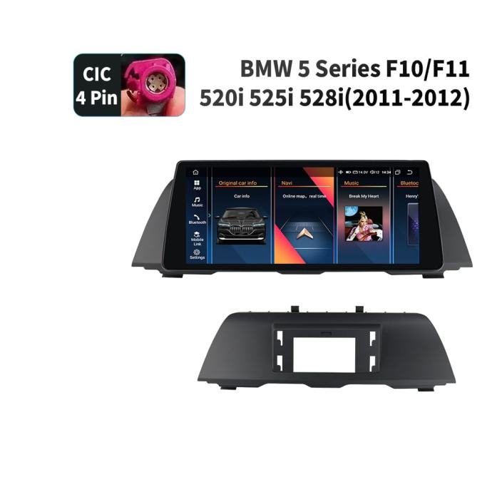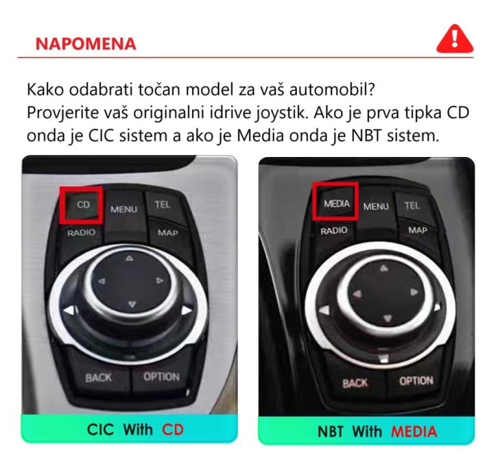 Napomena: ovaj model multimedije je isključivo za CIC. Prema zadnjoj slici provjerite koji konektor imate u slučaju da je drugi konektor (NBT) molimo da odaberete drugi model sa naznakom NBT. U pravilu se CIC u BMW 5 F10 koristio od 3mj./2010 do 9mj./2012 a NBT od 9mj./2012 do 2017 godine, ali svejedno najbolje je provjeriti. Ova multimedija podržava samo AUX izlaz originalnog auta – prema predzadnjoj slici u postavkama provjerite da li vaš radio podržava AUX izlaz. Svi konektori su plug and play te maska odgovara za BMW seriju 5, 10-17 godište. Na slici kod Idrive joystika ako imate CD tipku onda je CIC sistem a ako imate media tipku onda je NBT sistem ali svejedno najbolje je provjeriti konektor prema zadnjoj slici.