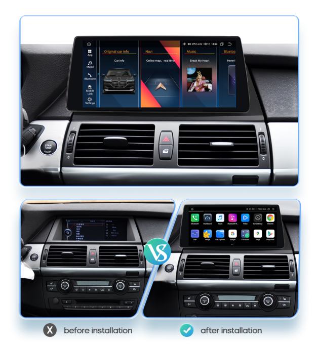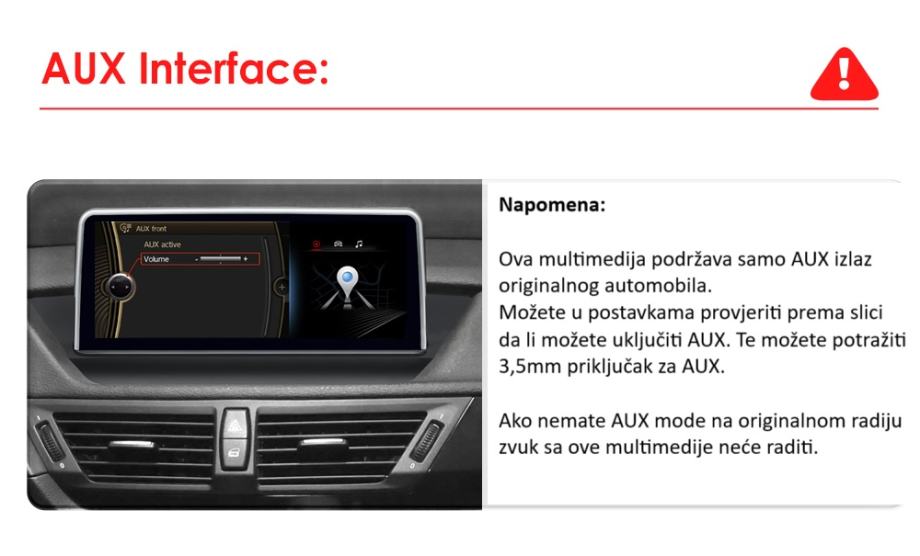 Napomena: ovaj model multimedije je isključivo za CIC priključak. Prema zadnjoj slici provjerite koji konektor imate u slučaju da je drugi konektor (CCC) molimo da odaberete drugi model sa naznakom CCC. U pravilu se CIC u BMW X5/X6 koristio od 3mj./2007 do 10mj./2009 a CIC od 10mj./2009 do 06mj./2013 godine, ali svejedno najbolje je provjeriti. Ova multimedija podržava samo AUX izlaz originalnog auta – prema predzadnjoj slici u postavkama provjerite da li vaš radio podržava AUX izlaz. Svi konektori su plug and play te maska odgovara za BMW seriju X5/X6, 07-14 godište.