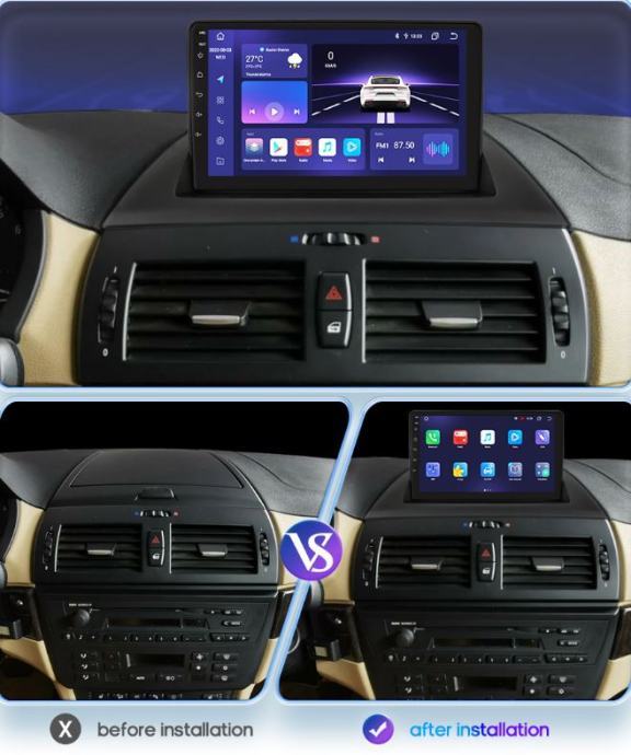 U kompletu: maska za BMW X3, autoradio 9” jačine prema izboru, 2xUSB kabel, 1xISO konektor za BMW, RCA input/output, antena konektor, konektor za kameru.