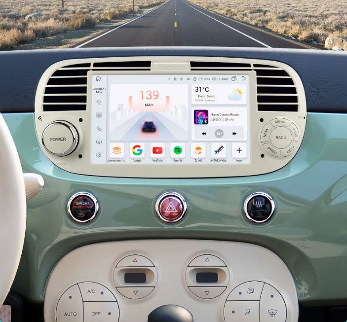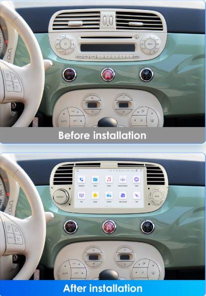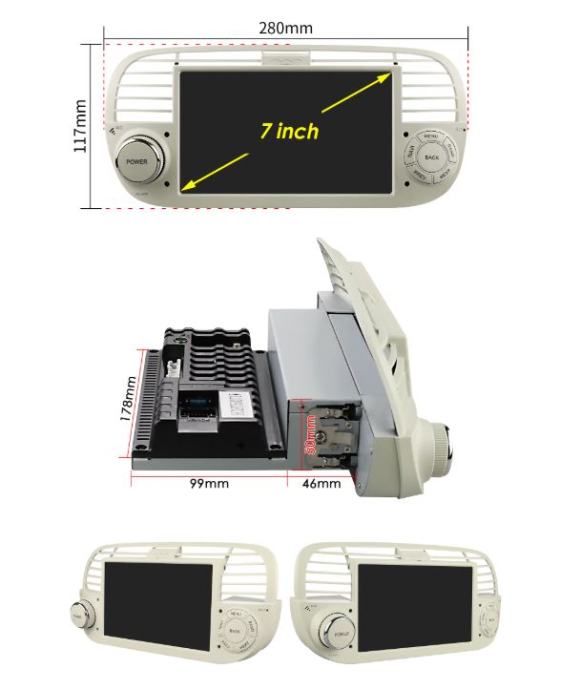 U kompletu: maska za Fiat 500, autoradio 7” jačine 2+32, 2xUSB kabel, 1xISO konektor za Fiat 500, RCA input/output, antena konektor, konektor za kameru.
