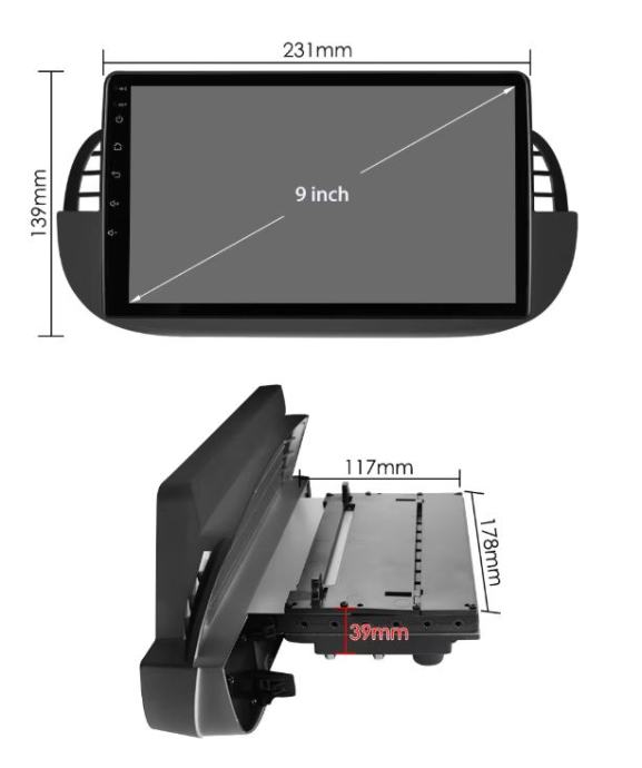 U kompletu: maska za Fiat 500, autoradio 9” jačine prema izboru, 2xUSB kabel, 1xISO konektor za Doblo, RCA input/output, antena konektor, konektor za kameru.