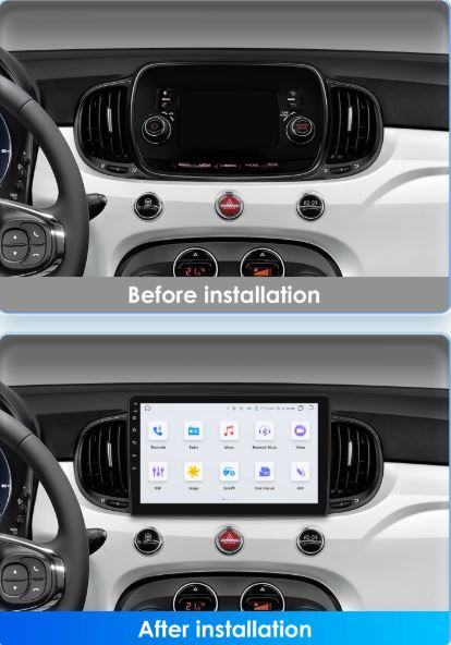 U kompletu: maska za Fiat 500, autoradio 9” jačine prema izboru, 2xUSB kabel, 1xISO konektor za Doblo, RCA input/output, antena konektor, konektor za kameru.