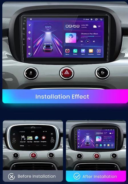 Multimedija android za Fiat 500 X 2014-2020 sa navigacijom, koji podržava reproduciranje glazbe i videa. Podržava spajanje s Wifi-jem, Bluetooth handsfree, reprodukciju sa USB-a te audio streaming.