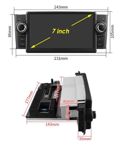 U kompletu: maska za Fiat Punto, autoradio 7” 2+32GB CP, 2xUSB kabel, 1xISO konektor za Doblo, RCA input/output, antena konektor, konektor za kameru.