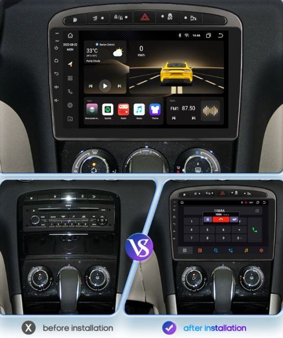 U kompletu: maska za Peugeot 308/408, autoradio 9” jačine prema izboru, 2xUSB kabel, 1xISO konektor za Peugeot, RCA input/output, antena konektor, konektor za kameru.