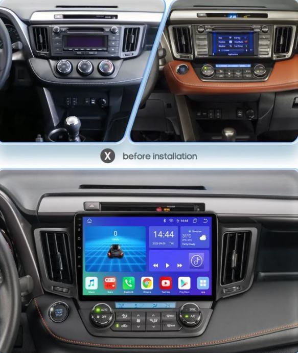 U kompletu: maska za Toyota Rav4, autoradio 10” jačine prema izboru, 2xUSB kabel, 1xISO konektor za Toyota, RCA input/output, antena konektor, konektor za kameru.