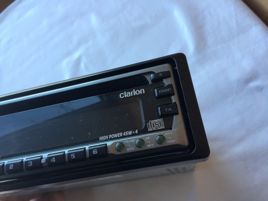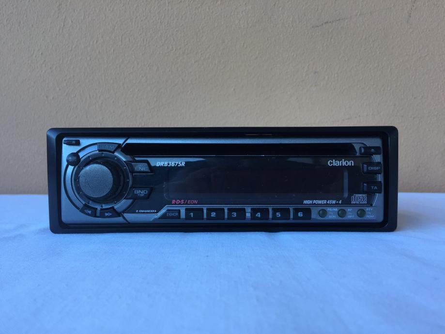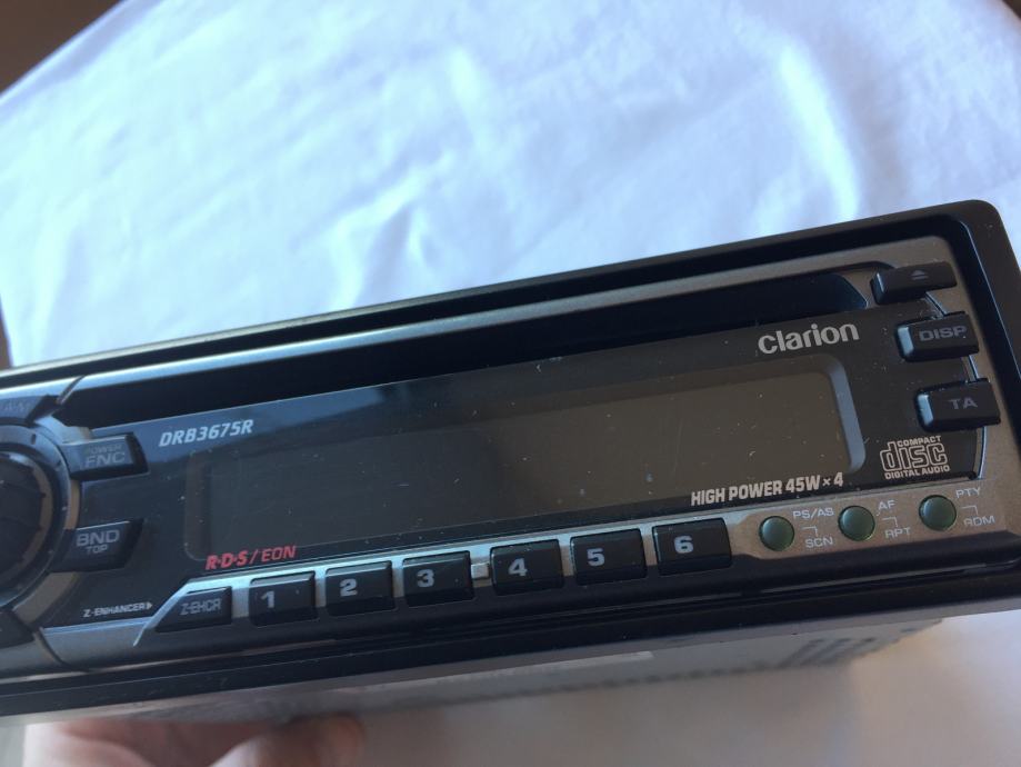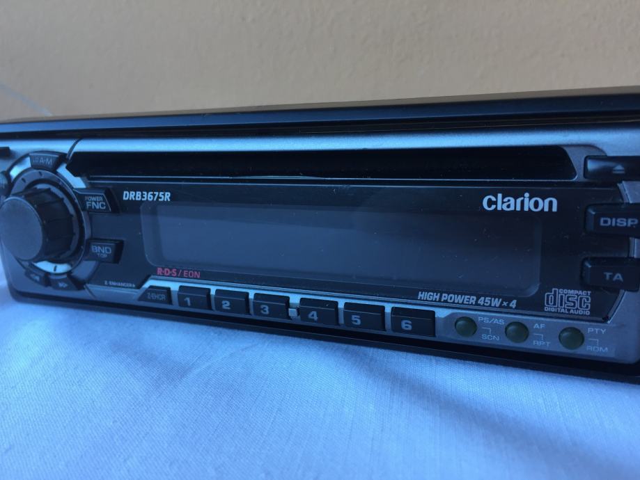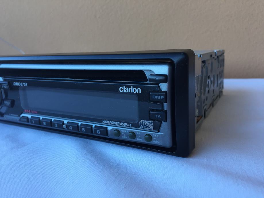 Prodajem potpuno ispravan radio-CD player Clarion DRB3675R, sa Euro scart utičnicama, bez limenog okvira za ugradnju. Kuke (sidra) plastičnog ukrasnog okvira su pukle, ali on se ne odvaja sam od uređaja u vožnji.