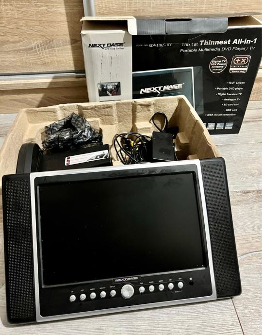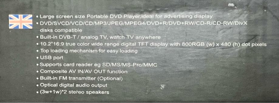 Prijenosni tv/dvd player, ima mogućnost čitanja zapisa sa dvd-a, usb-a i SD/MS/MMC kartice. Može se koristiti i kao TV, ali bi mu trebao dvb-t2 prijemnik. Dolazi sa nosačem za naslon sjedala u autu, auto punjač i svi ostale kablove i antene.