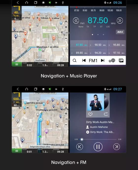 GPS + Radio+RDS + Bluetooth + A2DP + TELEFONSKI IMENIK + Punjenje mobitela preko radija + USB & SD + WiFi + AUX + Mirror Link + MAPE