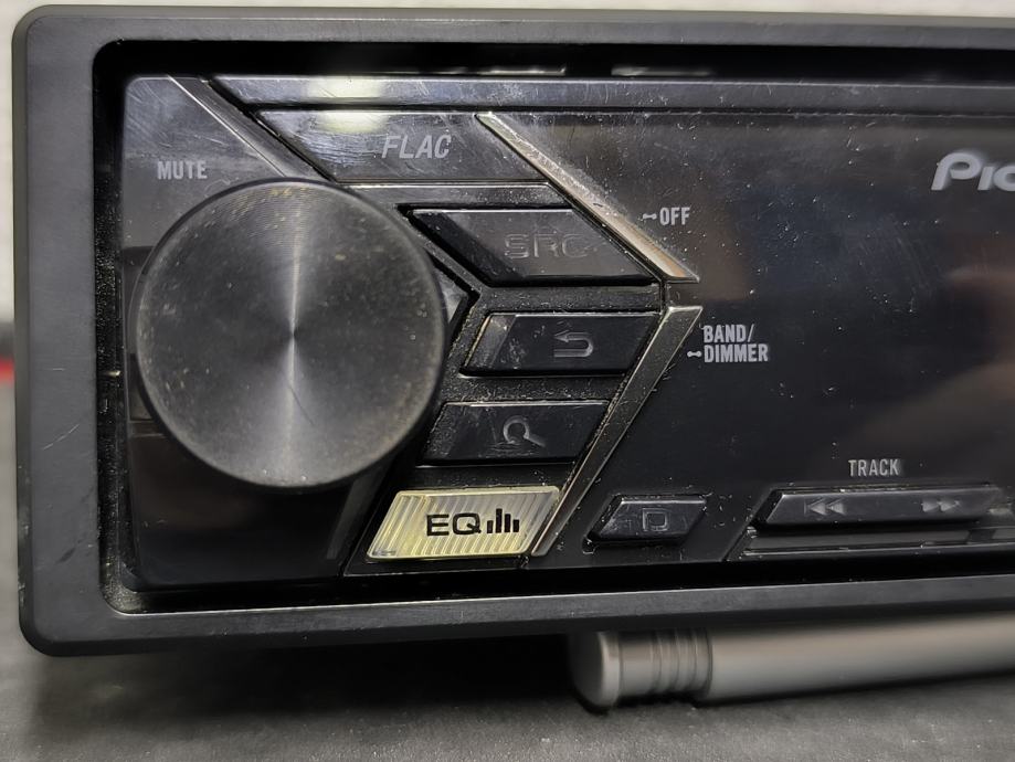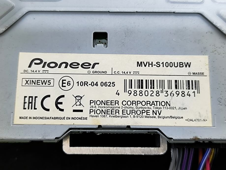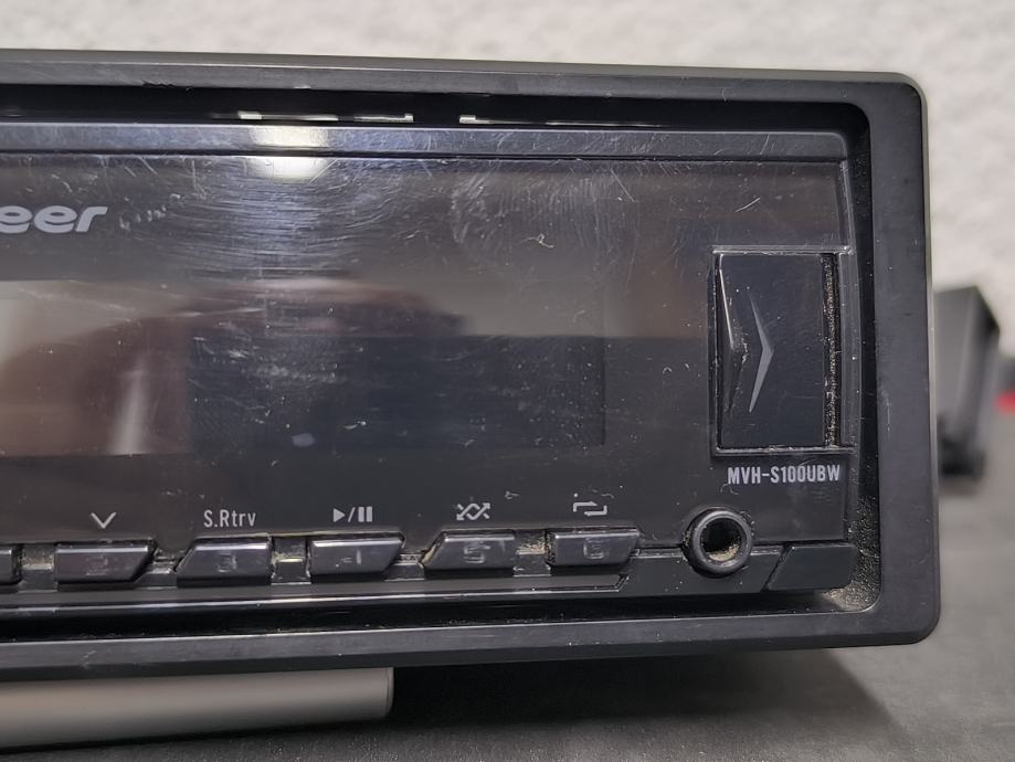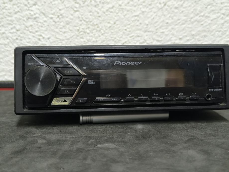 Pioneer autoradio model MVH-S100UBW. Radi se o single DIN uređaju bez CD čitača, s podrškom za USB i aux ulaz. Podržava reprodukciju FLAC audio formata, ima ugrađeni equalizer te funkciju MUTE i BAND/DIMMER. Upravljanje je intuitivno putem fizičkih tipki i okruglog upravljača za glasnoću.