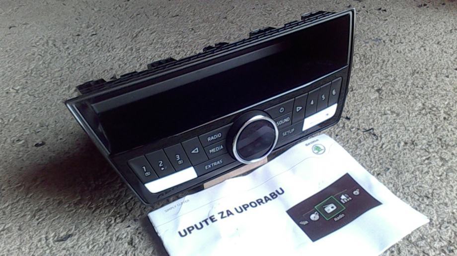 Na okrugloj tipki se nalazi ekran gdje kod paljenja se pojavi škodin logo, na ekranu piše kad je ukljucen usb , sd aux , radio, itd
