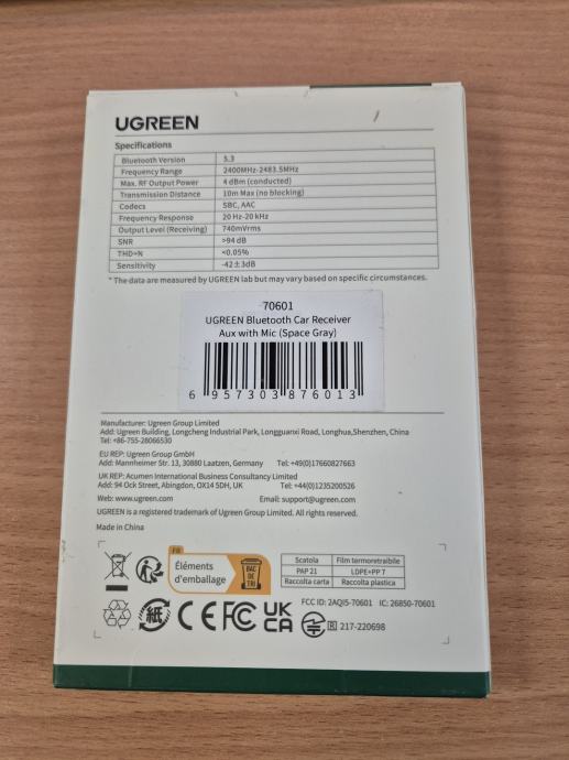 UGREEN Car Bluetooth Audio Receiver sa mikrofonom, BT 5.3