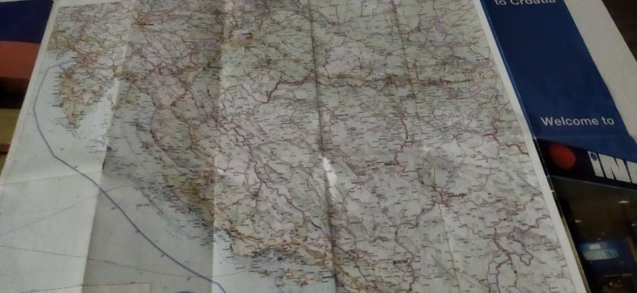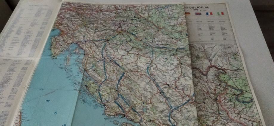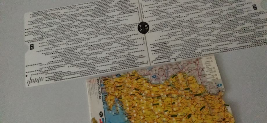 Auto karta Jugoslavije s udaljenostima.Perforirana,jer ima uložak s 36 gradova Jugoslavije,za koje su pokazane udaljenosti do brojnih mjesta i gradova,iz 60-tih god.- 6e