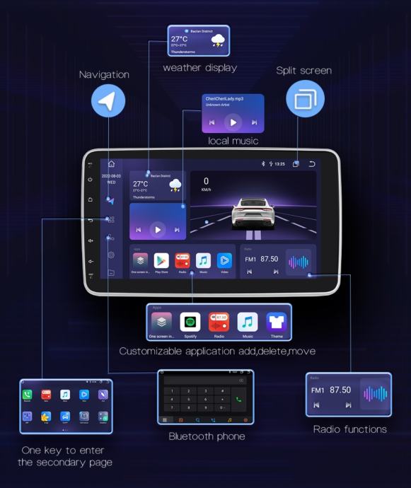 GPS + Radio+RDS + Bluetooth + A2DP + TELEFONSKI IMENIK + Punjenje mobitela preko radija + USB & SD + WiFi + AUX + Mirror Link + MAPE