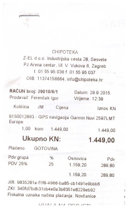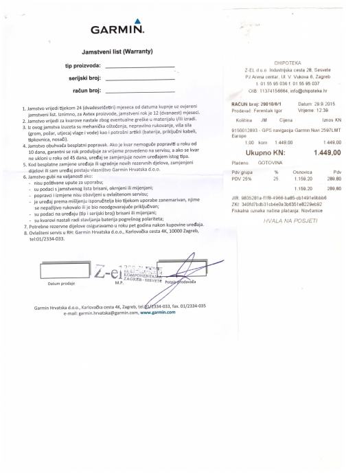Navigacija je plaćena 29.09.2015. u Arena centru u Chipoteci 1.449,00. Garancija je 2 godine a korištena je točno 5 sati! Ušteda je s torbicom gotovo 600 kuna a dobijete novi novcati uređaj sa garancijom i računom!