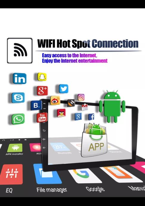 GPS + Radio+RDS + Bluetooth + A2DP + TELEFONSKI IMENIK + Punjenje mobitela preko radija + USB & SD + WiFi + AUX + Mirror Link + Mape + INTERNET (YouTube, Google, Facebook...) + HANDSFREE