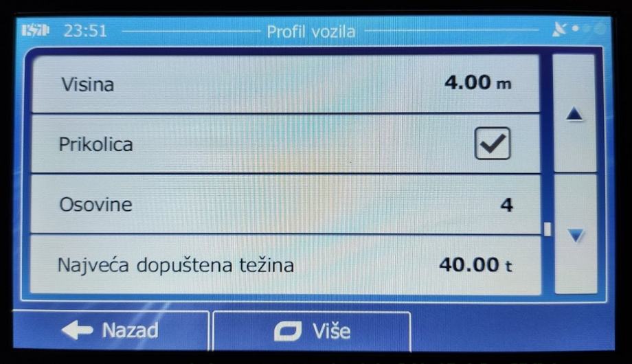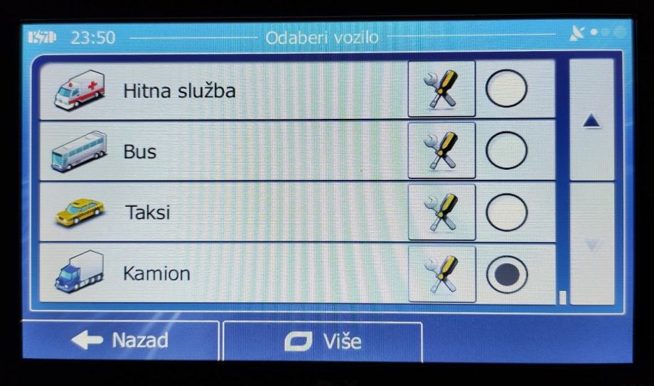 Svaka opcija ima još dodatne opcije tako se za kamion mogu upisati: visina, širina, dužina, najveća dopuštena težina, stvarna težina, broj osovina, prikolica, vrsta tereta , konfiguriranje trajanja vožnje...