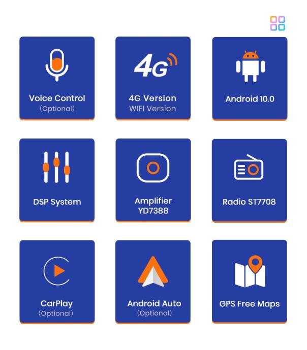 Navigacija radi na sustavu Android 13, 64-bitni četverojezgreni procesor sa 2G RAM-a i 32G ROM-a za pohranu, HD multitouch ekran za gladak i praktičan rad. Miltimedija ima ugrađen Carplay i Android Auto i povezivanje je bežično-wireless, podržava DAB+ ali DAB+ USB box nije u paketu. Podržava USB, Bluetooth, SD, MP3, WIFI .....