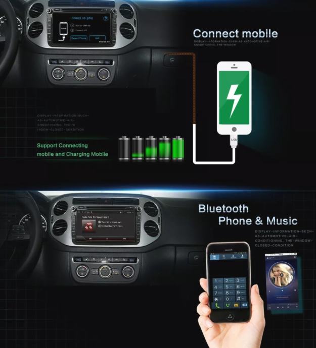 GPS + Radio+RDS + Bluetooth + A2DP + TELEFONSKI IMENIK + Punjenje mobitela preko radija + USB + WiFi + AUX + Mirror Link + MAPE cijele Europe + HANDSFREE