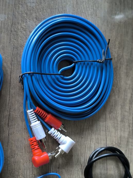 PKompletni set kablova za spajanje autopojačala, potpuno nov. Set sadrži sve potrebne kablove za instalaciju pojačala u automobilu - plavi RCA sa kutnim konektorina za signal, crveni kabel za napajanje + sa osiguračem, kraći plavi kabel za remote, te crni kabel za uzemljenje (masu). Svi kablovi su kvalitetno izvedeni s debljom izolacijom i pouzdanim konektorima.