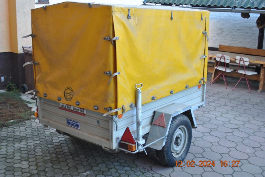 Auto prikolica(žuta s ceradom), BEZ PAPIRA, dimenzije 200x120x110. Naletna kočnica, kiper, ručna kočnica, nosivost 900kg.