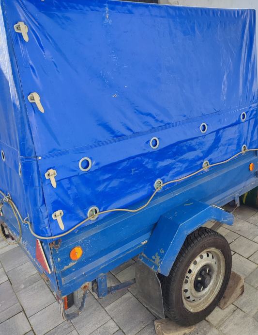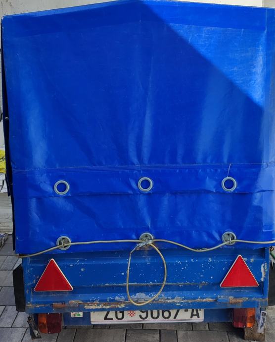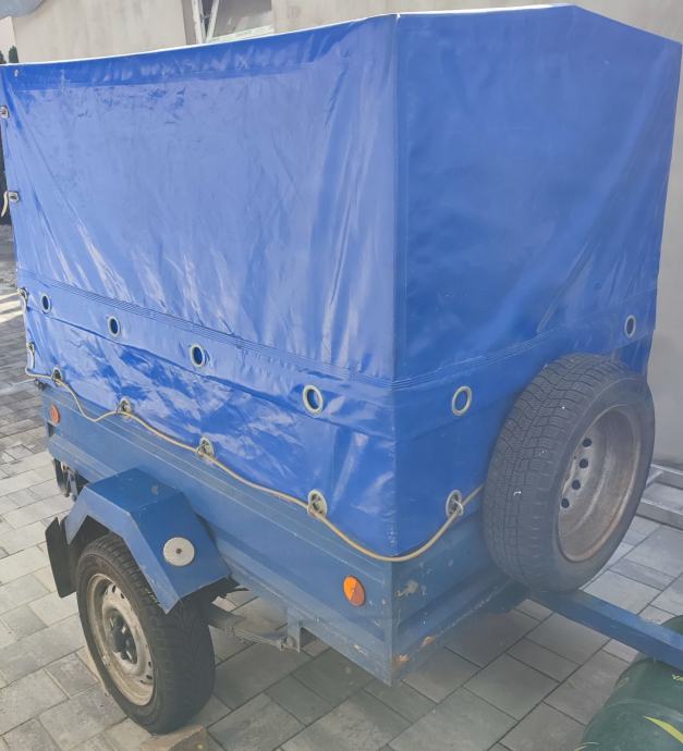 Auto prikolica samogradnja, registrirana, unutarnje dimenzije dužina 156cm, širina 102cm, visina stranice 35cm, cerada podesiva u 2 visine, ukupna visina s ceradom 97cm ili 120cm. Zimske gume 2023 godina. Rezervna guma isto uz prikolicu