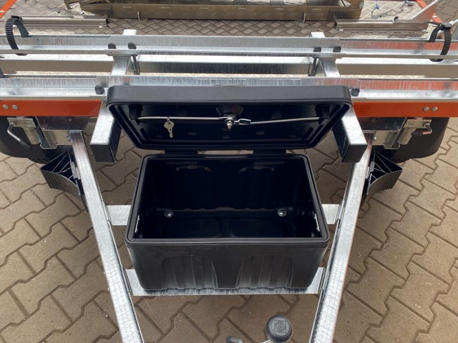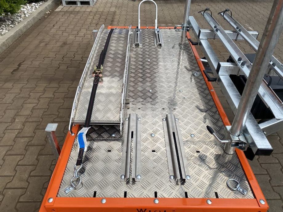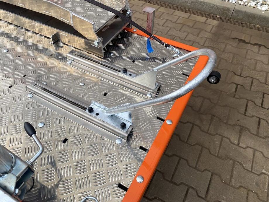 Gornja aluminijska konstrukcija s podnicom od kariranog lima opremljena je sa 6 podnih ručki. Nosač motocikla ima podesivi razmak, zahvaljujući čemu se može prilagoditi dužini motocikla.