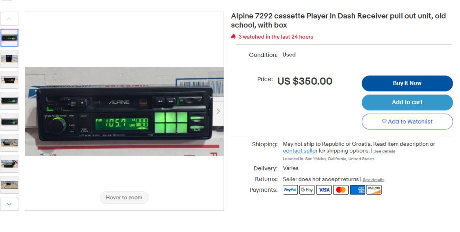 "Adjust the bass and let the Alpine blast". Prodajem ovaj kultni radio kasetofon iz 90tih. Stanje 10/10, potpuno ispravan, sva led svijetla rade sve je potpuno ispravo. Na radiju je i euro-konekt tako da ga možete i sami spojiti. Na njega možete spoji i bluetooth adapter tako da možete puštati glazbu putem mobitela. Alpine u 80tim i 90tim je ekskluzivno koristio Lamborghini. Cijena kao i svemu oldschool ide samo gore, na slikama pogledajte kako se kreću cijene ne ebay-u.