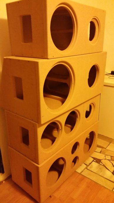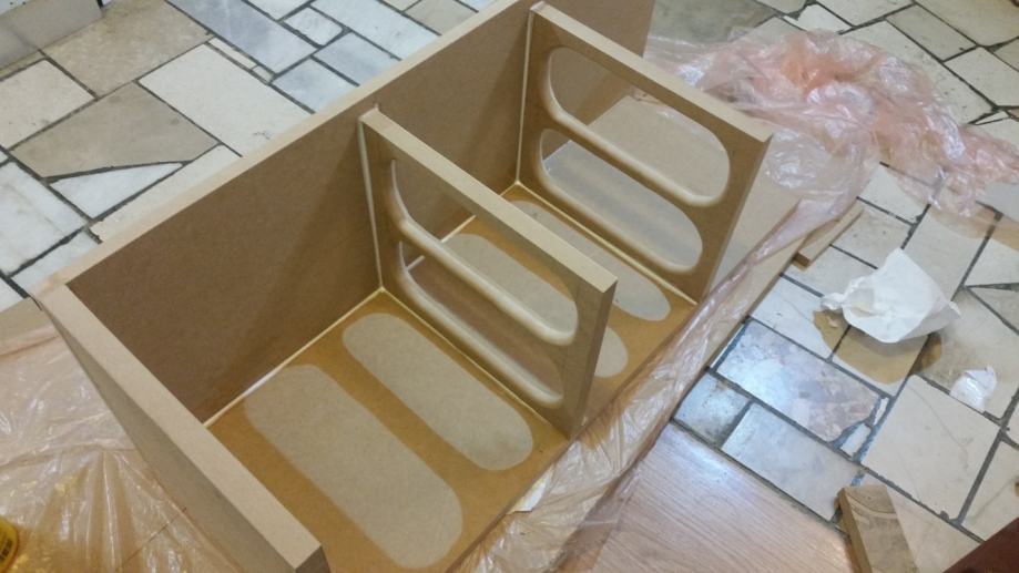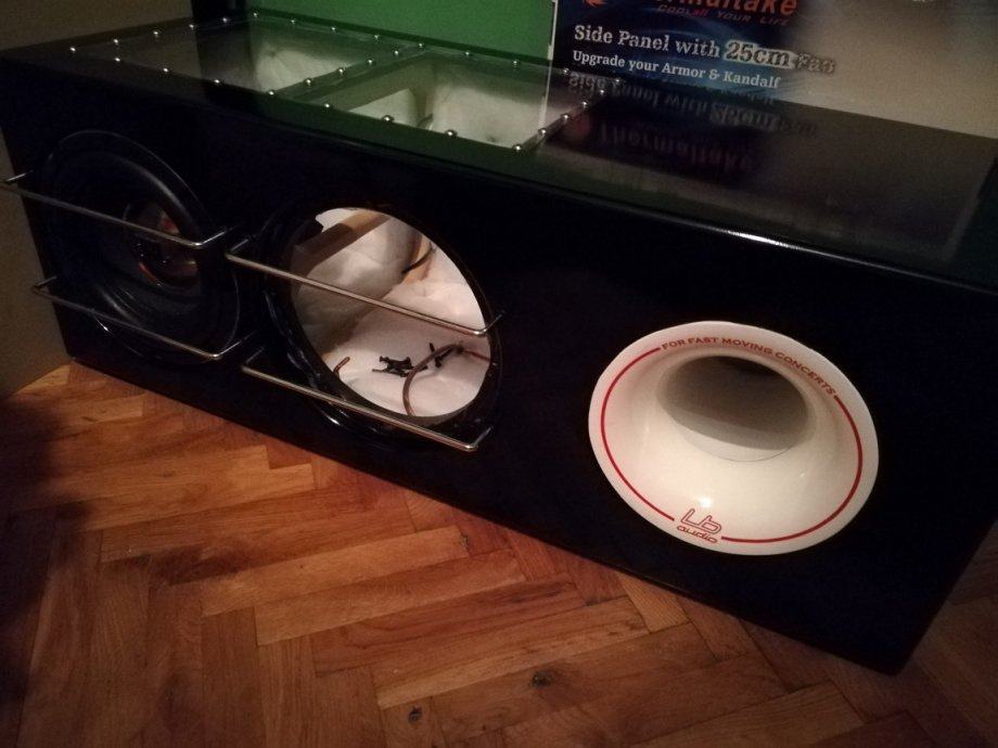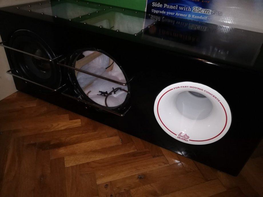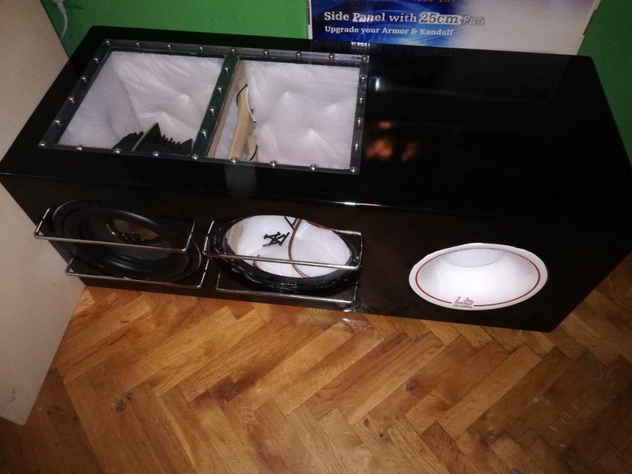 Kutija je rađena vrlo vrlo kvalitetno i bez štednje. Prednja stranica 2x18mm (36mm) ostale 25mm. Dvije rešetke u sredini kutije za dodatnu krutost. Spajana vijcima i ljepilom, svi vijci pokitani i finiš rađen sa 2 sloja poliuretanskog baznog laka + crni visoki sjaj poliuretanski 2 komponentni. Plexiglass 15mm, ledice s mjenjanjem boja na daljinski, iz nutra fiberfill na 3 stranice debljine 25mm te silentcoat damping 2mm. Aeroport ručna izrada od fiberglasa 5" LB audio. Dva terminala, nogice, profesionalne ručke za nošenje. kutija ima oko 45kg BEZ zvučnika te nije baš za slanje poštom. Cijena utrošenog materijala je preko 2000kn i oko 35-40 sati rada. Ako nekog zanima što to može toliko koštat u toj kutiji neka se javi pa ću mu rado navest stavku po stavku. :D