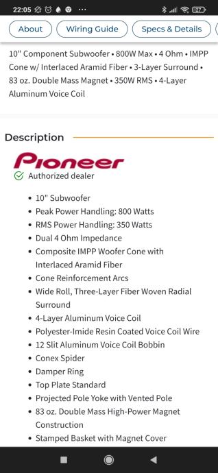 - Pioneer woofer 10" TS-W256DVC dual voice 800W =100E