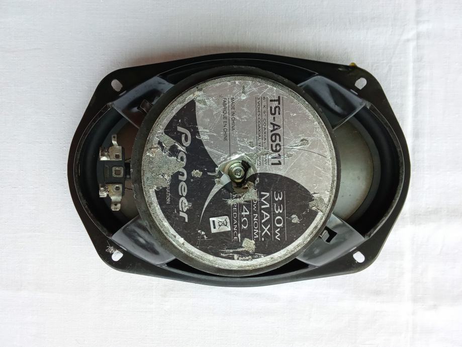 Prodajem samo jedan trostazni koaksijalni elipsasti zvučnik Pioneer TS-A6911, standardnih dimenzija 9x6 inča, maksimalne snage 330 W, nominalne snage 80 W, pri otporu 4 Ohma. Čitav je, bez pukotina, na njemu postoje isključivo površinska oštećenja. Fotografije priložene uz oglas prikazuju ovdje oglašeni predmet. Cijena je fiksna.