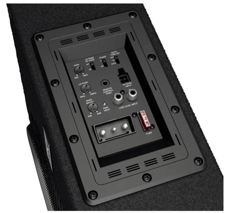 The Prima APBX 10 AS2 active subwoofer, with the 10-inch driver, features a dedicated high-performance amplification module that enhances all the passive box technologies, such as the 2S²(2 Sides / 2 Sounds) design, the Plug & Play terminal block and ultra-compact size. The amplification module, with power outputs of 400W RMS, is developed with he-li technology (high efficiency / low impedance), which thanks to the absence of the DC-DC voltage booster reaches the impressive 90% efficiency level, very close to the theoretical limit of the D-Class. New input stage DBT (Dynamic Bass Tracking) technology allows 100% use of the he-li (High-Efficiency Low Impedance) amplifier power and to enjoy a tense and dynamic bass even at very high listening volumes. Eliminating the voltage booster was made possible thanks to the development of the new dual coil drivers, which inherit all the technological background of the Prima subwoofers, but differ for the ultra-low impedance (0.16 ohms for APBX 10 AS). This feature ensures a perfect synergy with the he-li (High-Efficiency Low Impedance) technology, maximizing the combination of amplifier, speakers, and sealed box, to obtain low, powerful, and crisp frequencies. The controls section is complete and provides optimal regulation of the low-frequency emission in the car cabin. The Butterworth low pass filter at 12dB/Oct. with variable cut-off frequency (50-200 Hz) can be bypassed when used with an AP bit processor with pre-out output dedicated to the sub. The adjustable bass-boost control (0 ÷ 6 dB) at 45 Hz allows the user to emphasize the response on the lower side of the spectrum. The high-level speaker-in input on the multi-pole connector eases the integration with OEM audio systems while the low-level input on RCA is dedicated to the connection with after-market sources. The subwoofer automatic turn on/off function ART (Automatic Remote Turn-On) can be configured to be controlled by the source remote signal, by the voltage variation on the high-level input, or by the audio signal on both inputs. Phase control (0-180°) completes the equipment. The SSP (Sub Smart Plug) terminal block is provided with a single Plug&Play connector to be able to disconnect the box easily and safely.