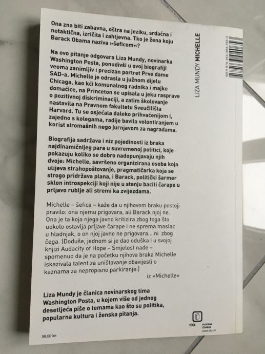 Ona zna biti zabavna, oštra na jeziku, srdačna i netaktična, izričita i zahtjevna. Tko je žena koju Barack Obama naziva šeficom? Na ovo pitanje odgovara Liza Mundy, novinarka Washington Posta, ponudivši u ovoj biografiji veoma zanimljiv i precizan portret Prve dame SAD-a. Michelle je odrasla u južnom dijelu Chicaga, kao kći komunalnog radnika i majke domaćice, na Princeton se upisala u jeku rasprave o pozitivnoj diskriminaciji, a zatim školovanje nastavila na Pravnom fakultetu Sveučilišta Harvard. Tu se je osjećala daleko prihvaćenijom i, zajedno sa kolegama, radije bavila volontiranjem u korist siromašnih nego jurnjavom za nagradama.