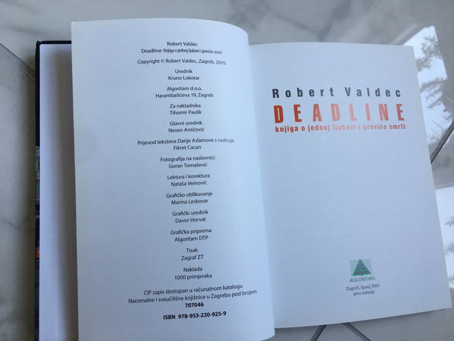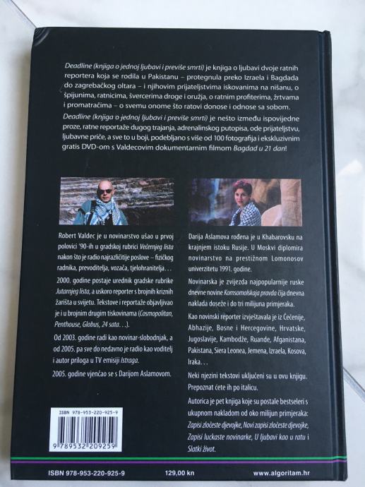 "Deadline" (knjiga o jednoj ljubavi i previše smrti) je knjiga o ljubavi dvoje ratnih reportera koja se rodila u Pakistanu – protegnula preko Izraela i Bagdada do zagrebačkog oltara – i njihovim prijateljstvima iskovanima na nišanu, o špijunima, ratnicima, švercerima droge i oružja, o ratnim profiterima, žrtvama i promatračima – o svemu onome što ratovi donose i odnose sa sobom.