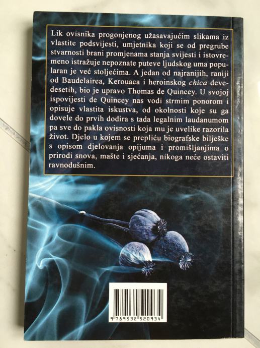 Lik ovisnika progonjenog užasavajućim slikama iz vlastite podsvijesti, umjetnika koji se od pregrube stvarnosti brani promjenama stanja svijesti i istovremeno istražuje nepoznate puteve ljudskog uma popularan je već stoljećima. A jedan od najranijih, raniji od Baudelairea, Kerouaca i heroinskog chica devedesetih, bio je upravo Thomas de Quincey. U svojoj ispovijesti de Quincey nas vodi strmim ponorom i opisuje vlastita iskustva, od okolnosti koje su ga dovele do prvih dodira s tada legalnim laudanumom pa sve do pakla ovisnosti koja mu je uvelike razorila život. Djelo u kojem se prepliću biografske bilješke s opisom djelovanja opijuma i promišljanjima o prirodi snova, mašte i sjećanja, nikoga neće ostaviti ravnodušnim.