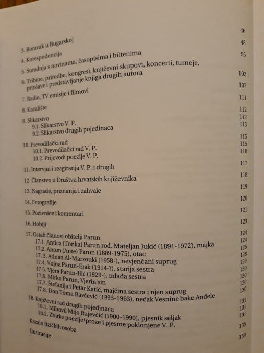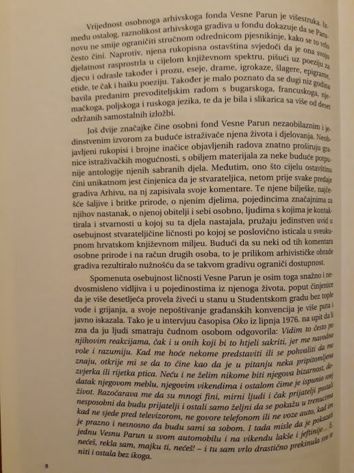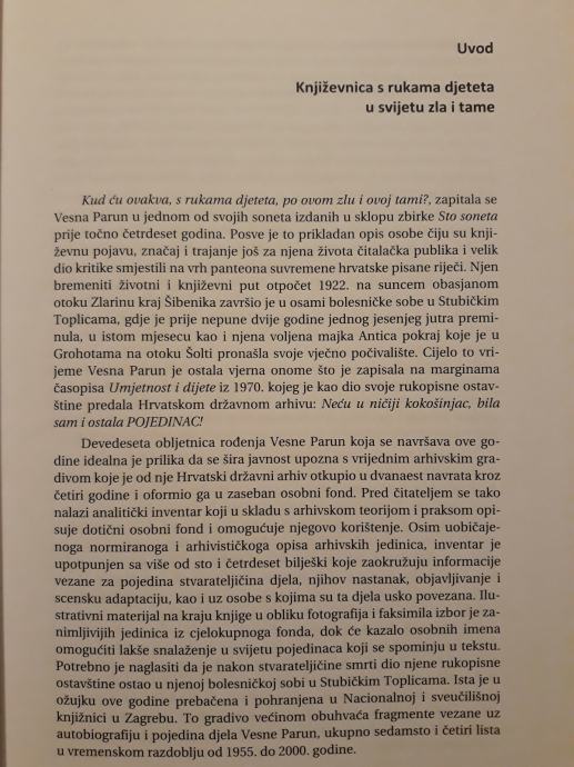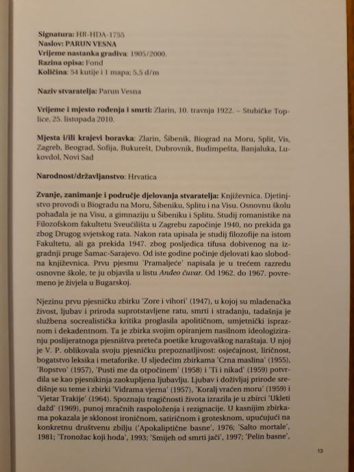 Knjiga donosi analitički inventar rukopisne ostavštine Vesne Parun koja se čuva u HDA. Korišteno arhivsko gradivo uglavnom se odnosi na njen dugogodišnji književni, ali i slikarski i kazališni rad, kao i kazališnu, radijsku i televizijsku djelatnost u kojima je bila vrlo aktivna. Analitički inventar dodatno je upotpunjen sa više od 140 bilješki kojima je autor inventara zaokružio informacije vezane za pojedina stvarateljičina djela, njihov nastanak, objavu, adaptaciju i ljude vezane uz njih. Dodatne informacije pruža objava faksimila odabranih izvornih rukopisa V. Parun (npr. njenih najranijih stihova), odabranog fotografskog gradiva i kazalo osobnih imena. Također je za ovu prigodu autor izdanja napisao i uvodni tekst. Ovo izdanje doprinos je središnje hrvatske arhivske institucije obilježavanju 90. obljetnice rođenja V. Parun.